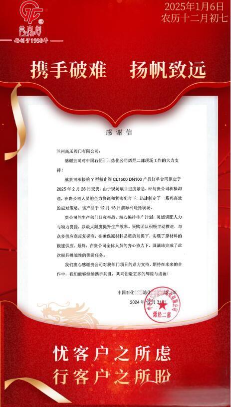 近日,蘭高閥喜獲一封來(lái)自客戶(hù)的感謝信,信中字里行間滿(mǎn)是對(duì)我司在產(chǎn)品訂單供貨任務(wù)中出色表現(xiàn)的高度贊譽(yù)與衷心感激。