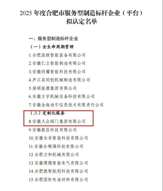 近日,合肥市工業(yè)和信息化局公示2025年度合肥市服務(wù)型制造標(biāo)桿企業(yè)(平臺)擬定名單,安徽大眾閥門集團(tuán)有限公司憑借在“制造+服務(wù)+解決方案”領(lǐng)域的深厚積淀與突出成效成功入選,這一榮譽(yù)標(biāo)志著公司在由傳統(tǒng)制造向服務(wù)型制造轉(zhuǎn)型的道路上取得了重要進(jìn)展。